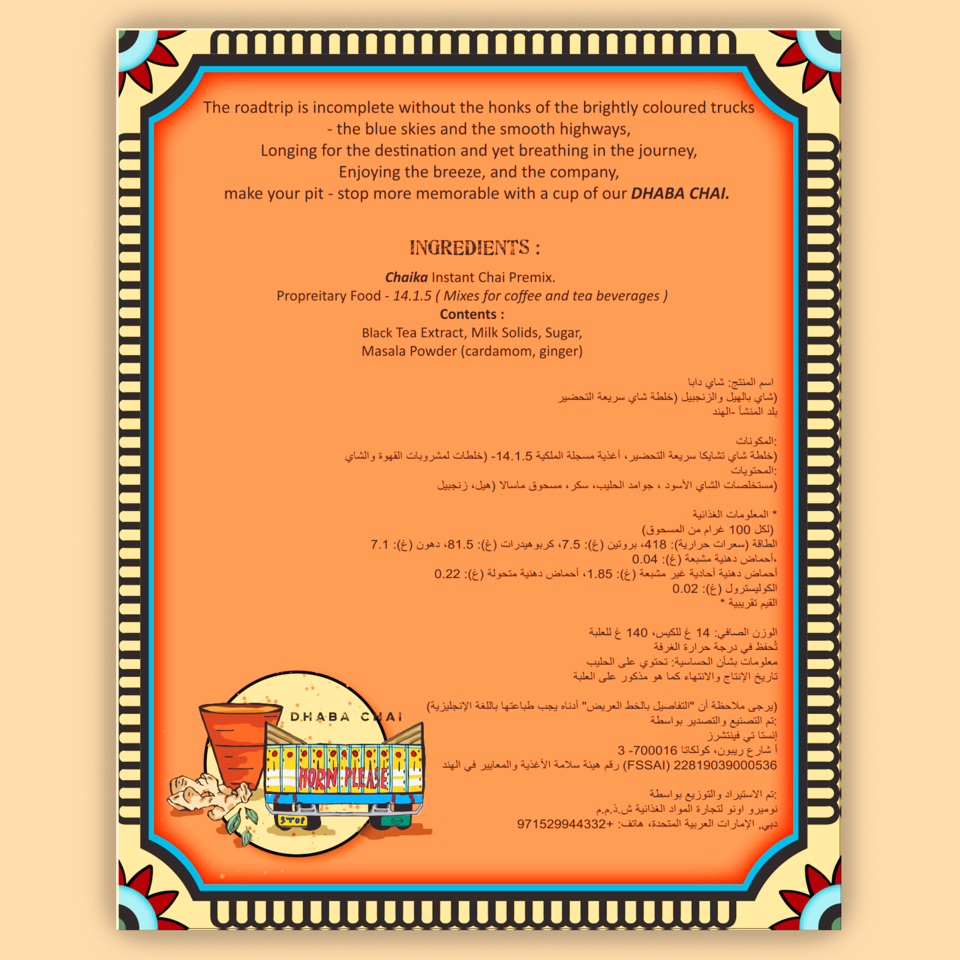The roadtrip is incomplete without the honks of the brightly coloured trucks, the blue skies and the smooth highways. Longing for the destination and yet breathing in the journey?Enjoying the breeze, and the company? Make your pit-stop more memorable with a cup of our Dhaba Chai.